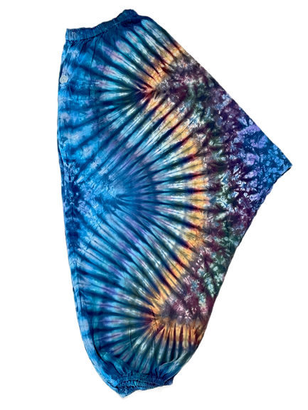 Silky soft, light weight, chill out Genie Pants with a pocket. These pants have elastic at the waist and ankles. Super comfortable! Plenty of crotch space.